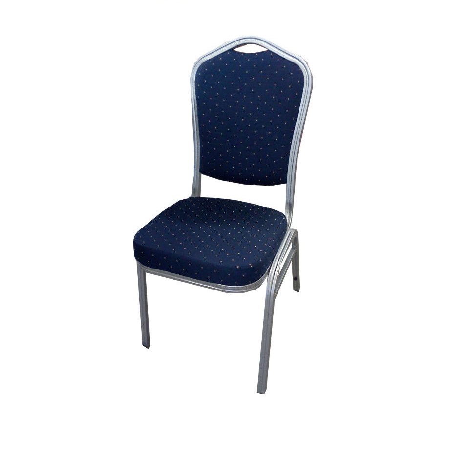 Стул банкетный. Стальной каркас серебристого цвета, обивка — синий жаккард, материал сидения — пенополиуретан. В наличии 98 штук.